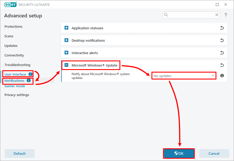 The notification levels correspond to Microsoft's ranking system for updates (low priority, common, important, and critical). If you disable Windows update notifications in your ESET product, we recommend you enable update notifications or automatic updating in your Windows operating system to keep your computer fully protected. Learn more about automatic updates from Windows.