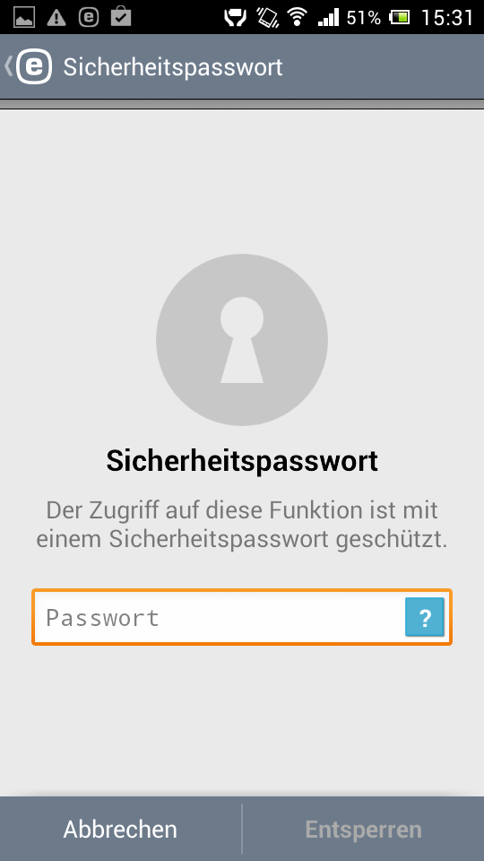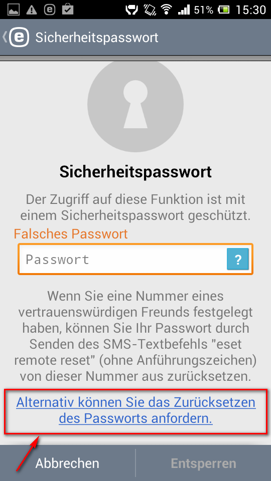 - Sie können sich nicht an das Passwort erinnern, das in ESET Mobile Security → Sicherheitspasswort hinterlegt wurde.