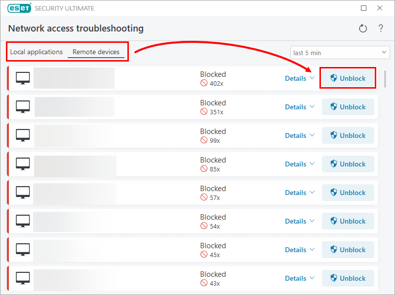 Klicken Sie auf die Registerkarte für lokale Anwendungen oder Remote-Geräte (in diesem Beispiel ist die Registerkarte Remote-Geräte ausgewählt). Suchen Sie Ihre Anwendung oder Ihr Gerät in der Liste und klicken Sie auf Aufheben der Blockierung. Wenn Ihre Anwendung oder Ihr Gerät nicht in der Liste aufgeführt ist, ist seine IP-Adresse möglicherweise vorübergehend blockiert. Sehen Sie sich an, wie Sie vorübergehend blockierten IP-Adressen eine Verbindung erlauben können.