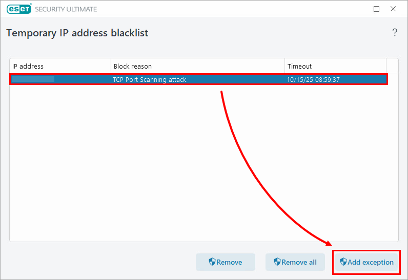Wählen Sie die IP-Adresse aus, die Sie für die Verbindung zulassen möchten, und klicken Sie auf Ausnahme hinzufügen.