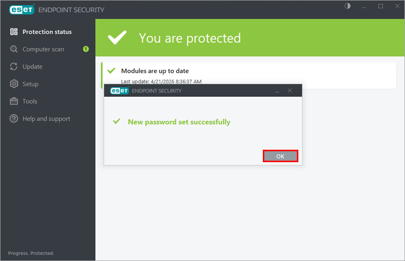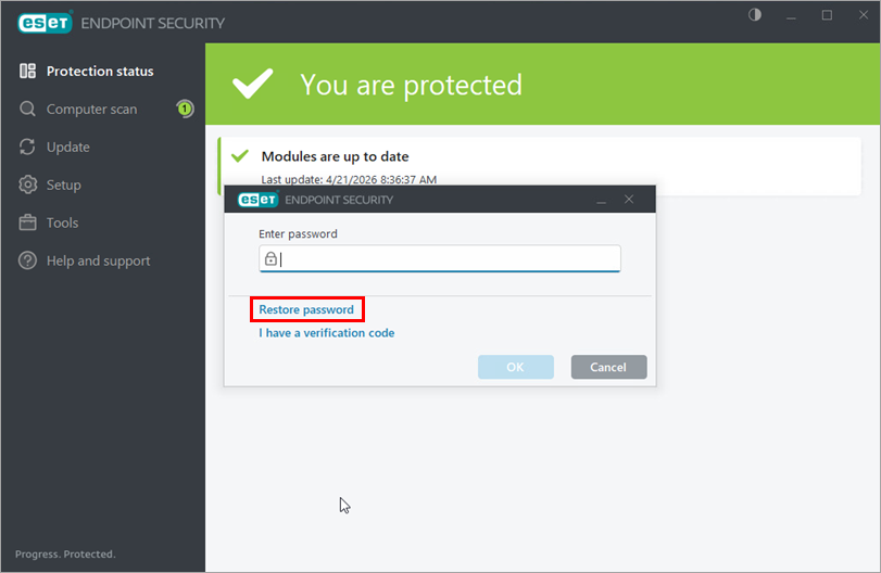 Kui ESETi rakenduses palutakse sisestada oma Advanced setup parool, klõpsake Restore Password (Parooli taastamine).