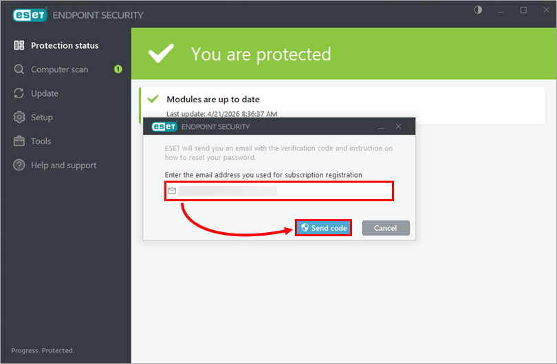 Sisestage ESETi rakenduses kasutatava tellimusega seotud e-posti aadress ja klõpsake nuppu Send Code. Kui te ei mäleta oma tellimuse e-posti aadressi, võtke ühendust ESETi tehnilise toega.