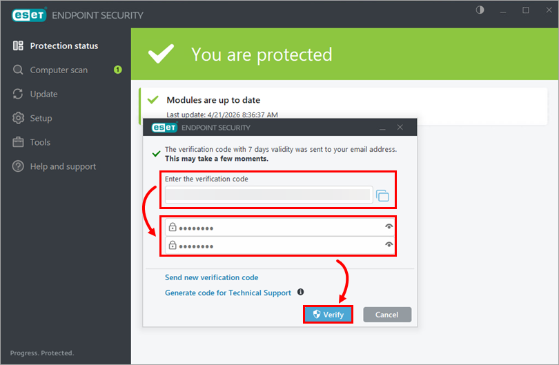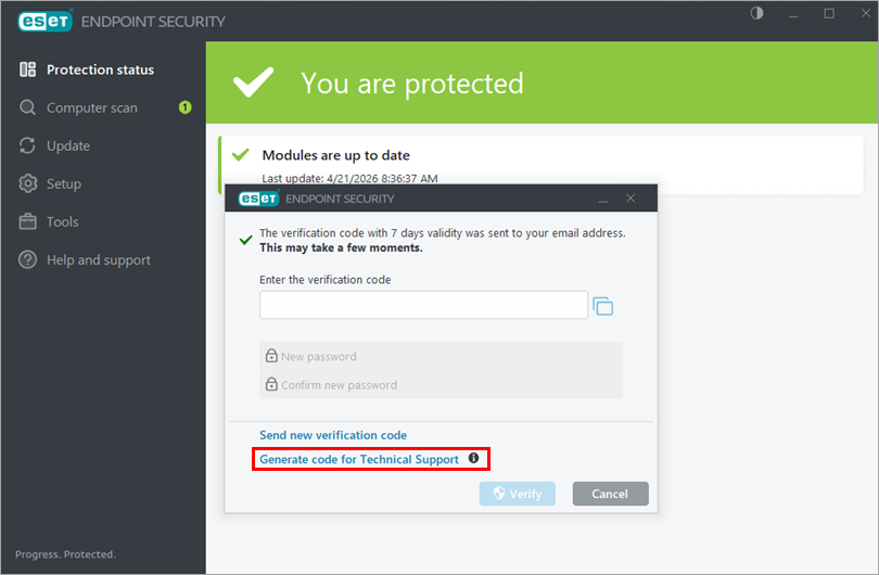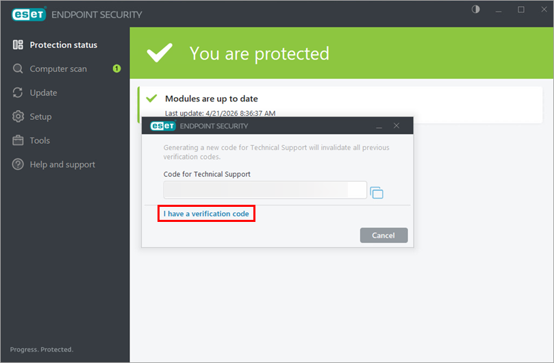 Kui ESETi tehniline tugi esitab teile kinnituskoodi, klõpsake nuppu Mul on kinnituskood.