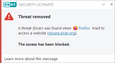 This type of notification is displayed when your ESET product detects a malicious file or communications that might damage your system. The Threat parameter displays the name of the threat that was detected.