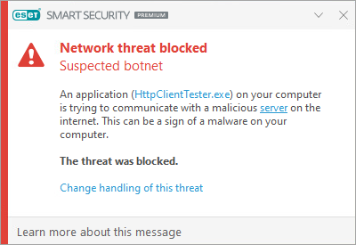 If your ESET product detects a suspected botnet, the Network threat blocked: Suspected botnet dialog will be displayed. You can click Change handling of this threat to change the way this detection will be handled.
