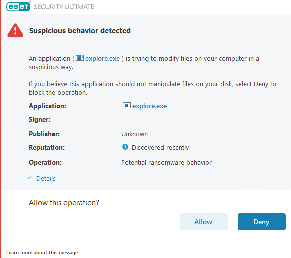 If your ESET product detects ransomware behavior, the Potential ransomware behavior detected dialog will be displayed. Click Allow or Deny to allow or deny the operation.