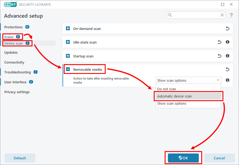 Click Scans → Device scan → Removable media. From the Action to take after inserting removable media drop-down menu, select Automatic device scan and click OK.
