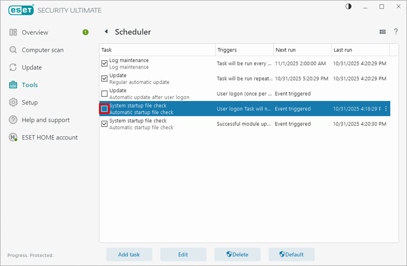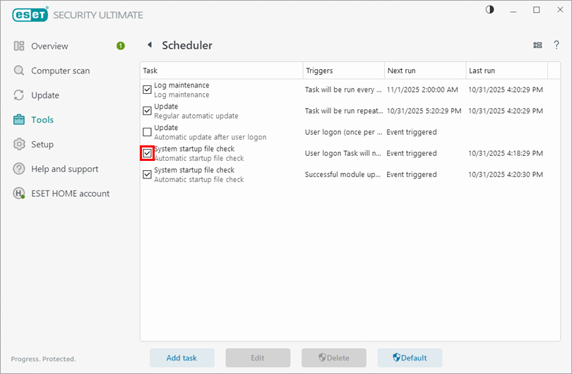 Figure 2-1 Select the check box next to System startup file check with the Triggers set as User logon (there will be multiple System startup file check tasks).