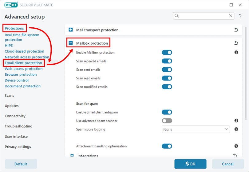 Click Protections → Email client protection and expand Mailbox protection.