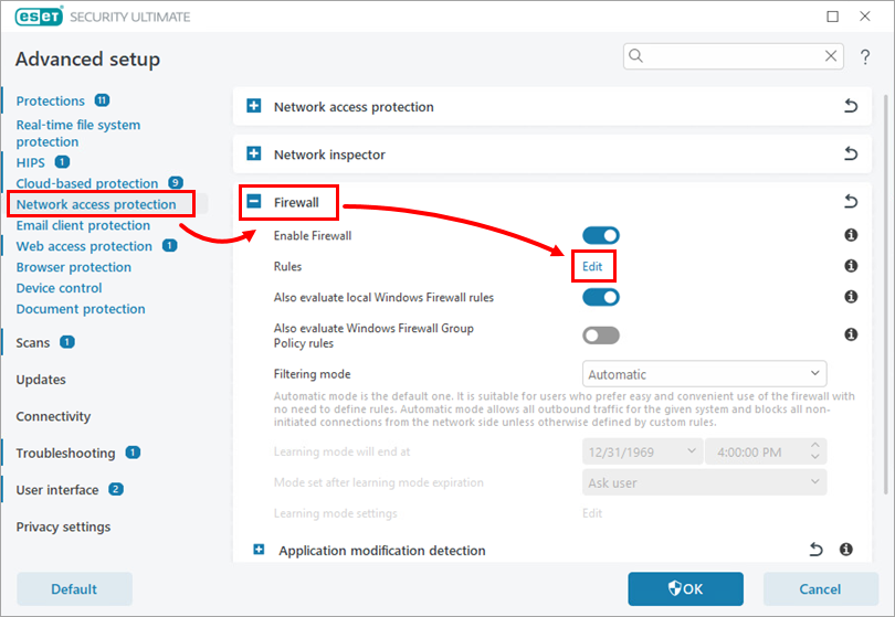 Click Network access protection, expand Firewall, and click Edit next to Rules.