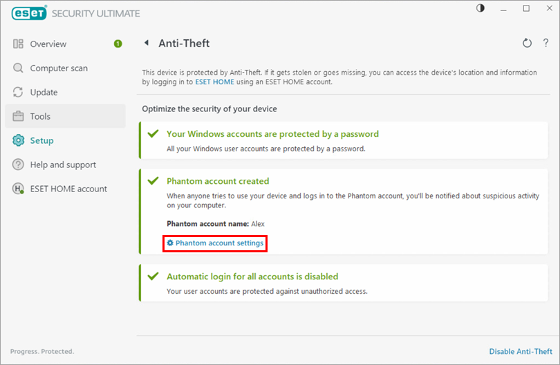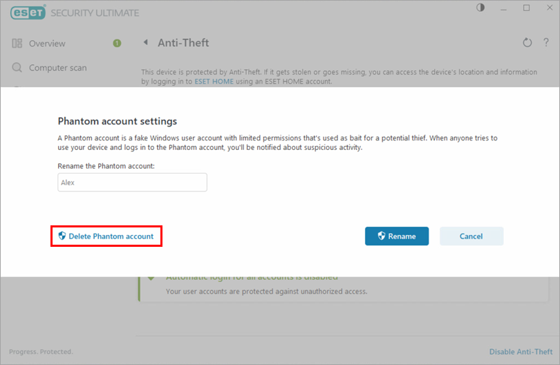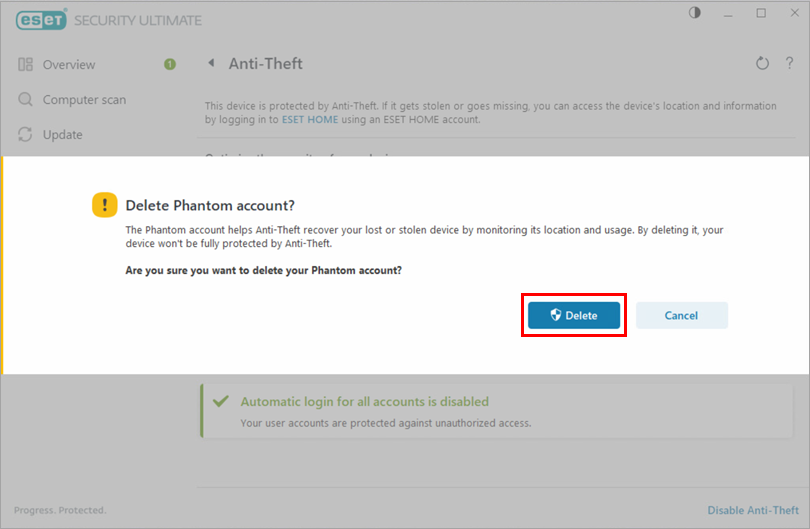 Your Phantom account was created during the setup of ESET Anti-Theft. To delete this Phantom account, follow the steps below.