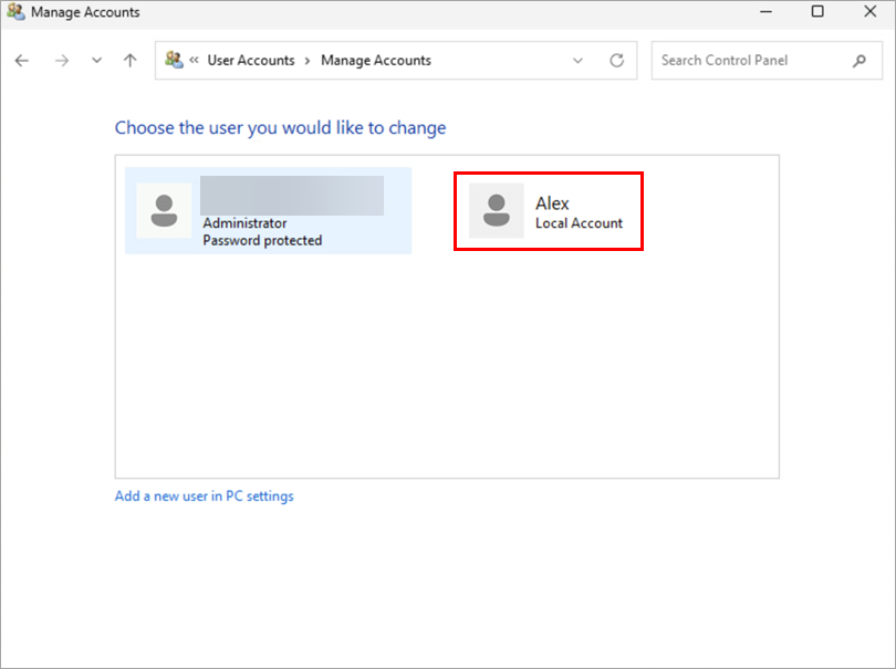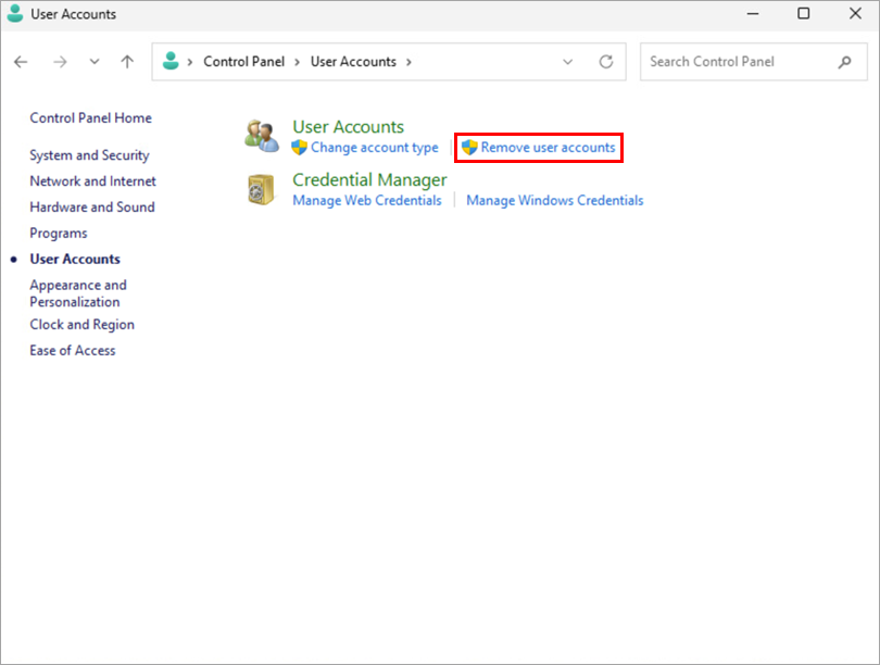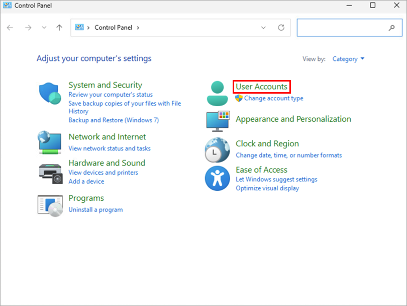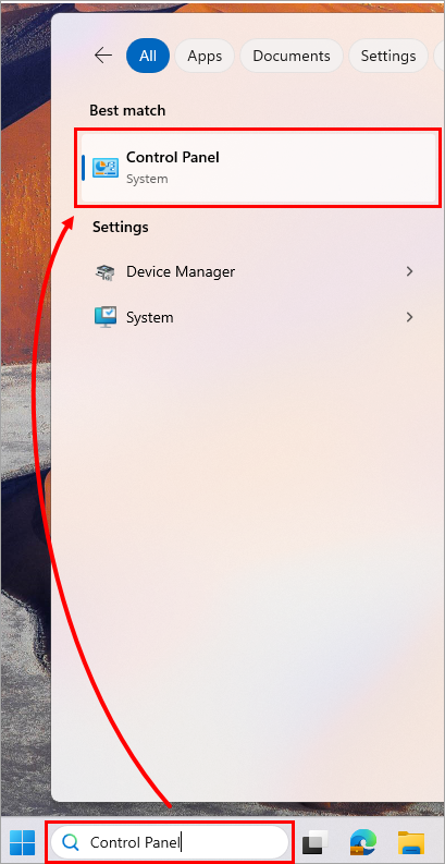 Ensure that you are logged in as an administrator. Click the search box on your taskbar, type in Control Panel, then click Control Panel in the results above.