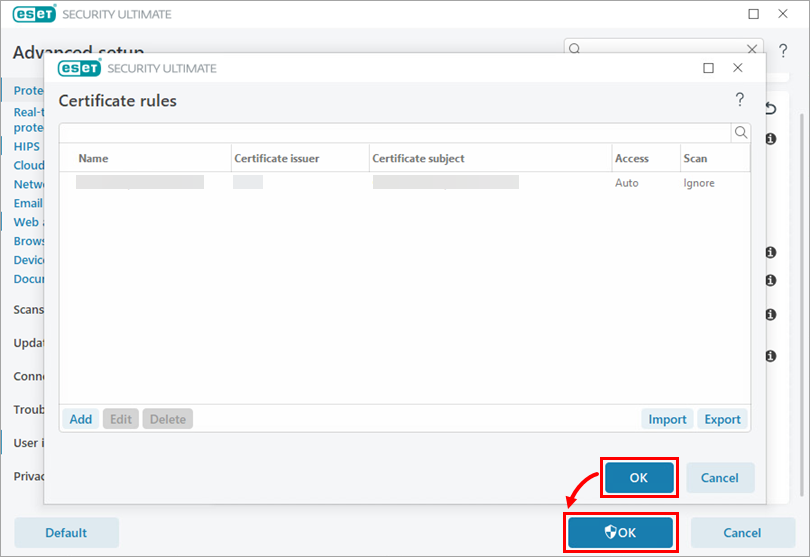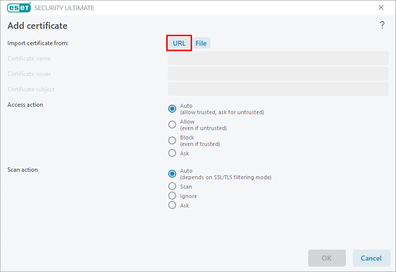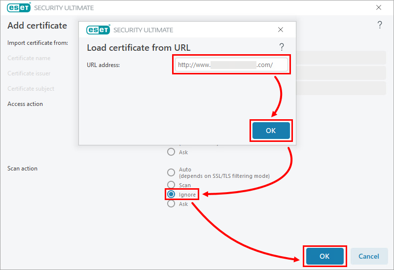 Copy the URL of the website whose certificate you are importing, paste it into the URL address field and click OK. In the Scan action section, select Ignore and click OK.
