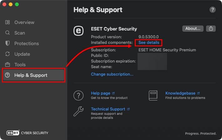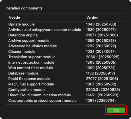 A list of installed components in your ESET Cyber Security product will be displayed. Click OK to close the dialog window.