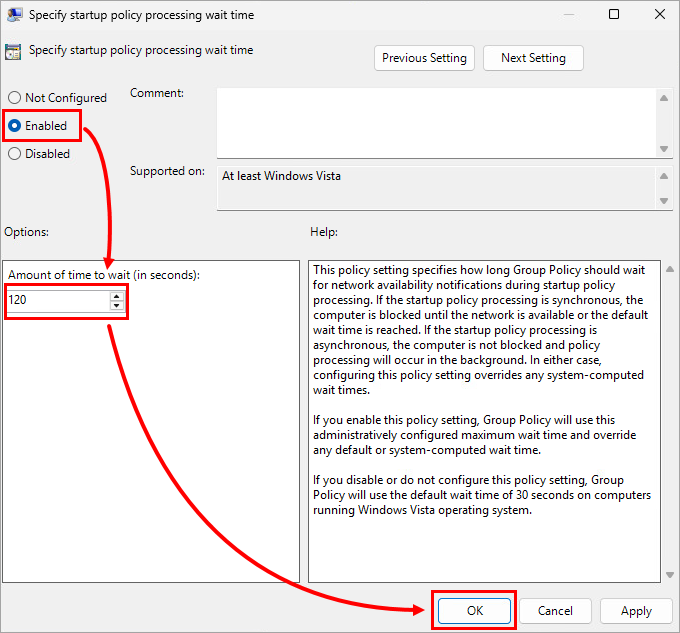 Select Enabled. You can change the pre-defined Amount of time to wait from the 120 seconds, but we recommend at least 30 seconds. Click OK.