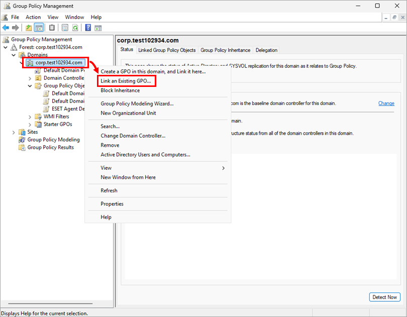 In the Group Policy Management window, right-click your domain and click Link an Existing GPO.
