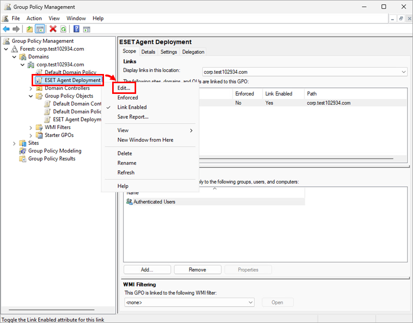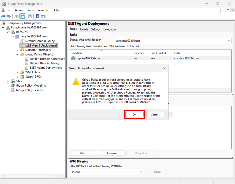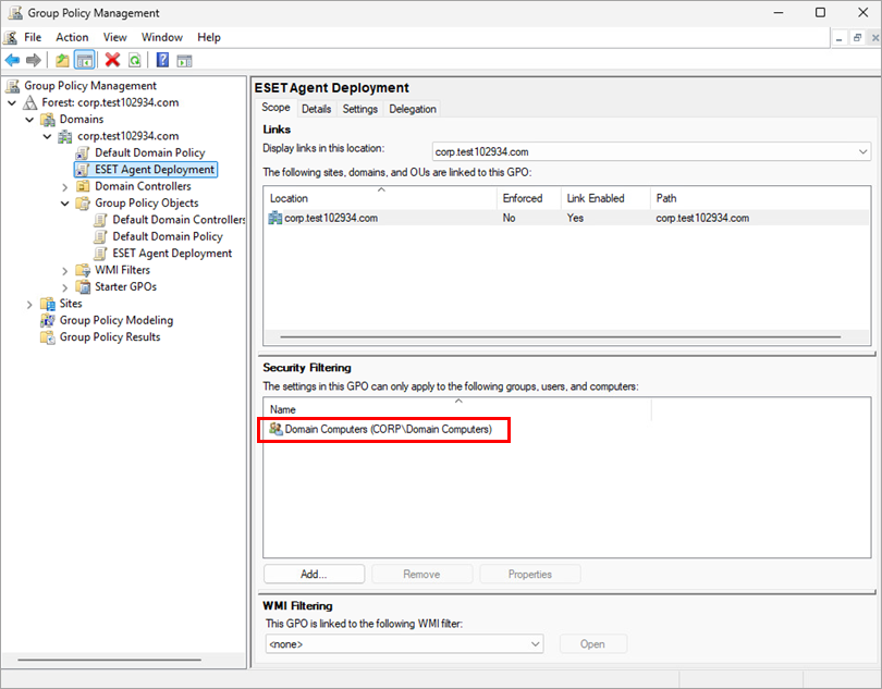 The new GPO is now assigned to the selected computers. When the chosen computers start, ESET Management Agent will be automatically installed.