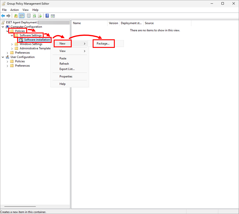 In the Group Policy Management Editor window, expand Policies → Software settings. Right-click Software installation and click New → Package.