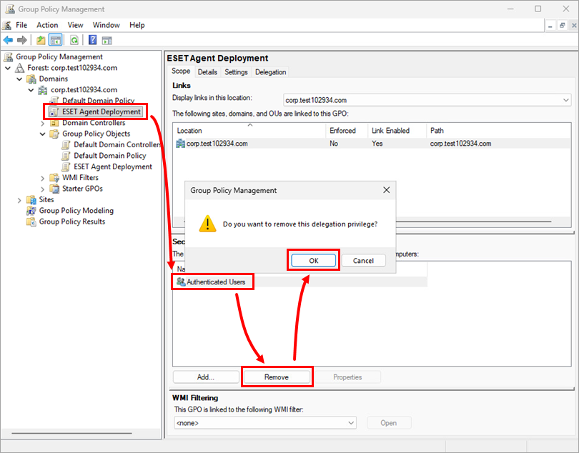 In the Group Policy Management window, click the new GPO. In the Security Filtering list select Authenticated Users and click Remove → OK.