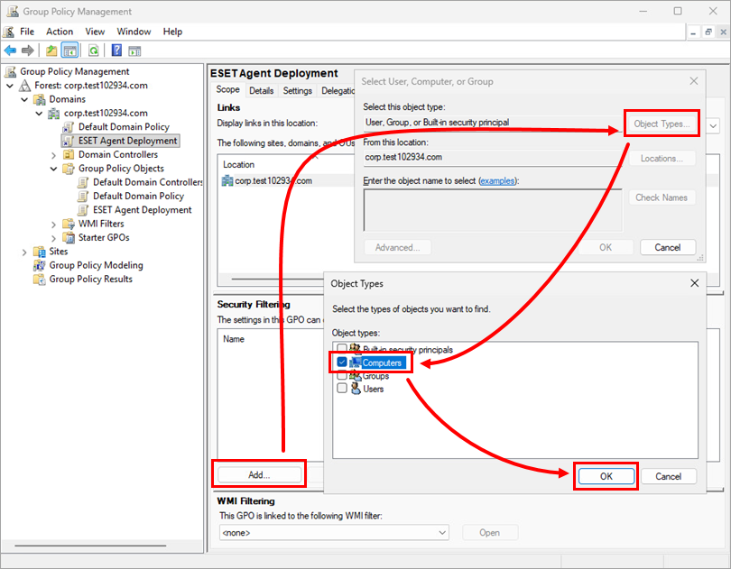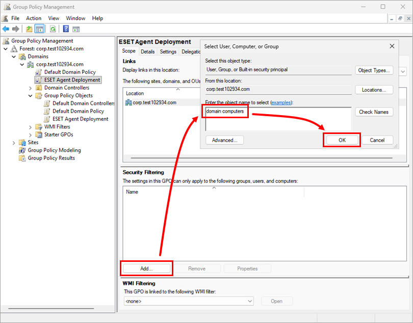 Assign the new GPO to all Domain computers: Click Add, type domain computers, and click OK.