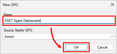 Type a name for the new GPO into the Name field (for example, ESET Agent deployment) and click OK.