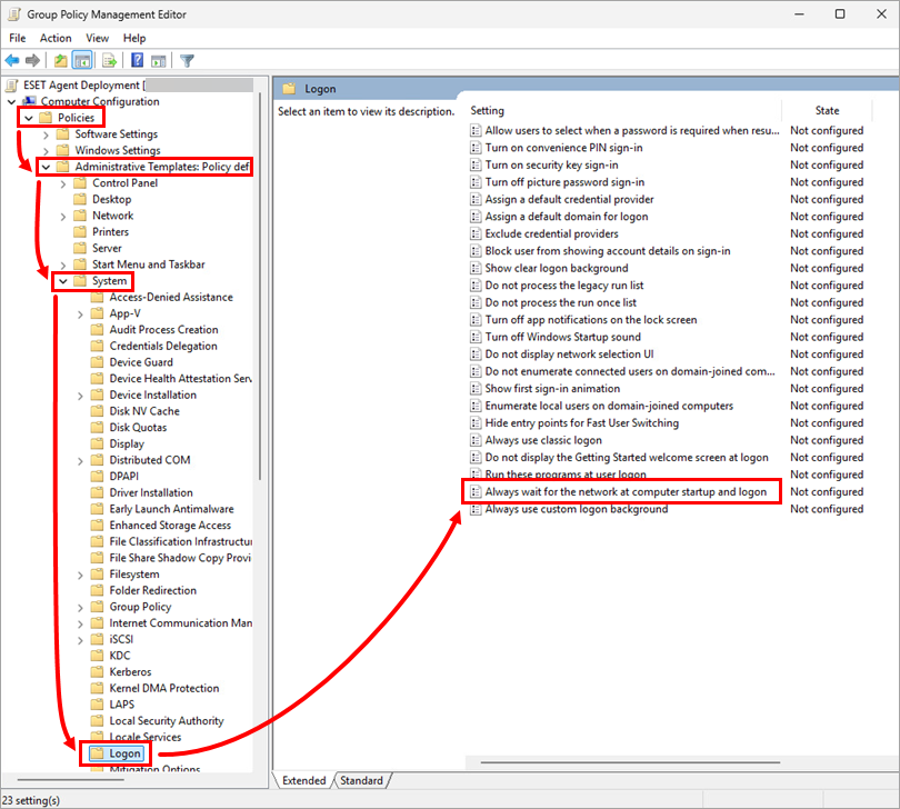 In the Group Policy Management Editor window, expand Policies → Administrative Templates: Policy definitions (ADMX files) retrieved from the local computer → System and click Logon. Double-click Always wait for the network at computer startup and logon.