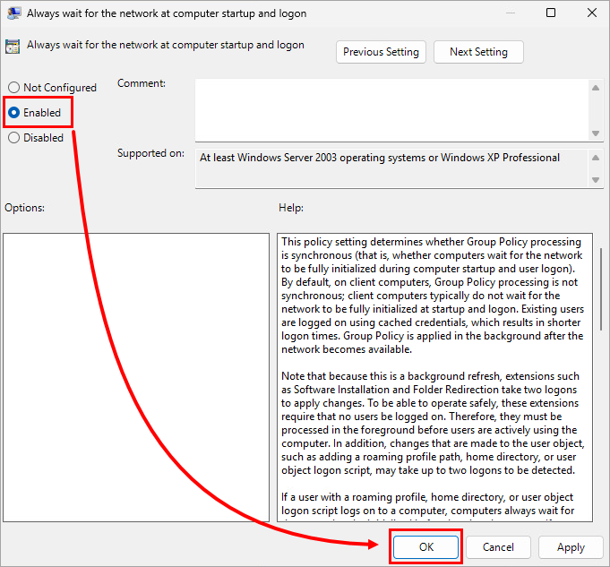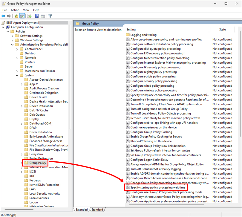 In the Group Policy Management Editor window, click Group Policy and double-click Specify startup policy processing wait time.