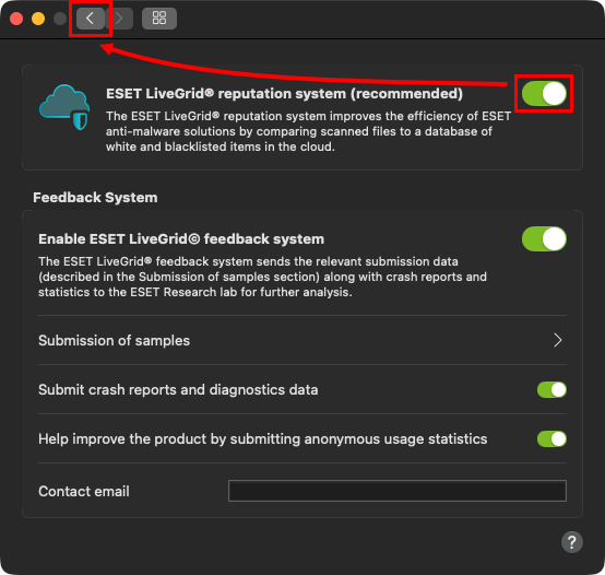 Click the toggle next to Enable ESET LiveGrid® reputation system (recommended) to enable or disable it. Click the back arrow to save your changes.