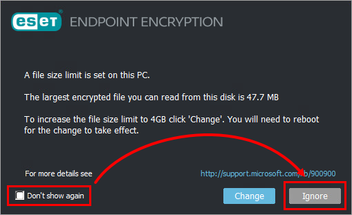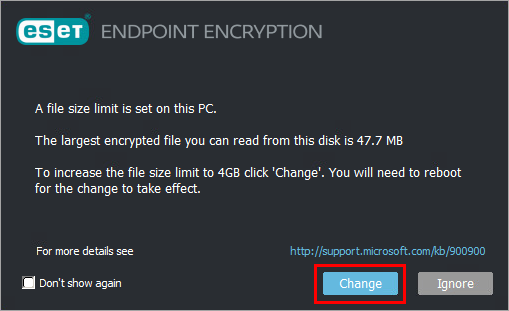The warning may appear due to a Microsoft known issue for some Windows versions related to the Web Distributed Authoring and Versioning (WebDAV) redirector, which is used by ESET Endpoint Encryption Go. For more details, refer to the following Microsoft Knowledgebase article: Folder copy error message when downloading a file that is larger than 50,000,000 bytes from a Web folder.