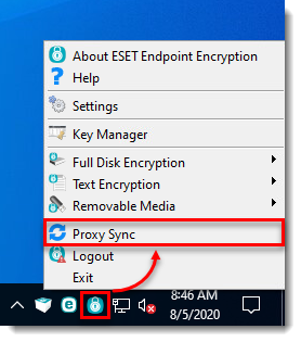 Right-click the ESET Endpoint Encryption icon in the system tray. If the Proxy Sync option is available, the client is managed by an EEE Server.