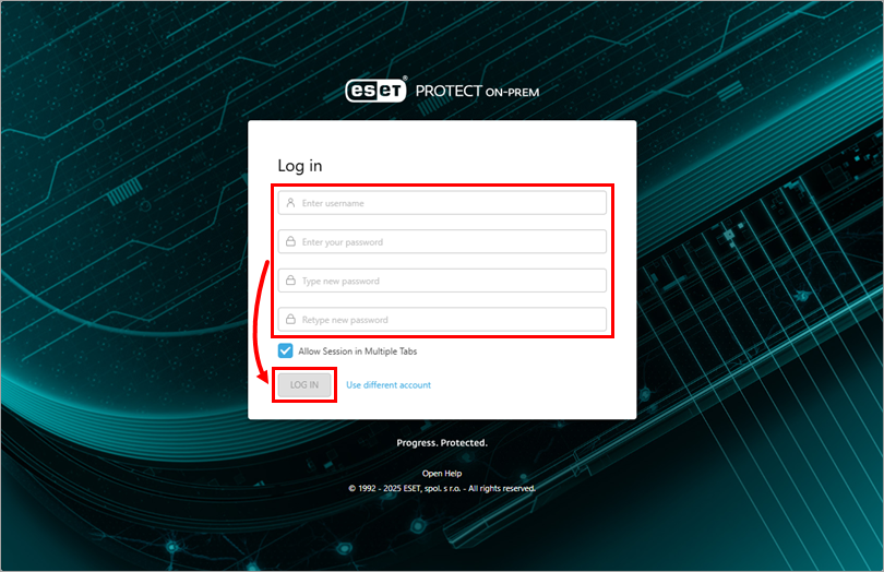Type your credentials and new password, and click Log in to save your changes and log you into the ESET PROTECT On-Prem Web Console. The password must contain at least 14 characters in at least three of these categories: lowercase letters, uppercase letters, numbers, or special characters. We recommend using a password with at least 17 characters.
