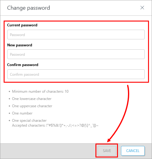 Type the existing password and the new one, and click Save.