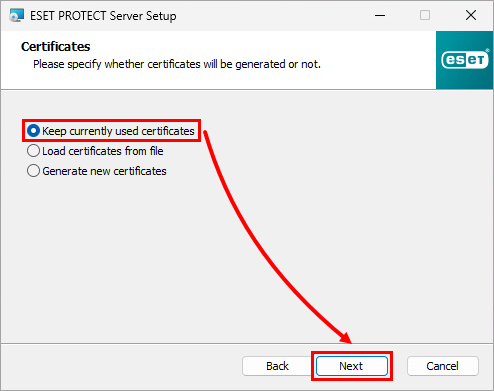 Select Keep currently used certificates and click Next.