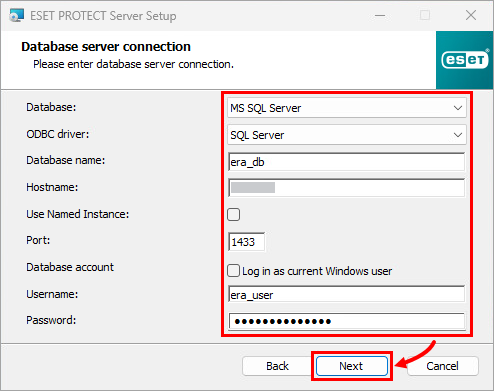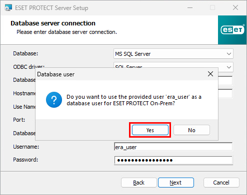 Complete all required fields in the Database server connection window, click Next and click Yes in the context window.