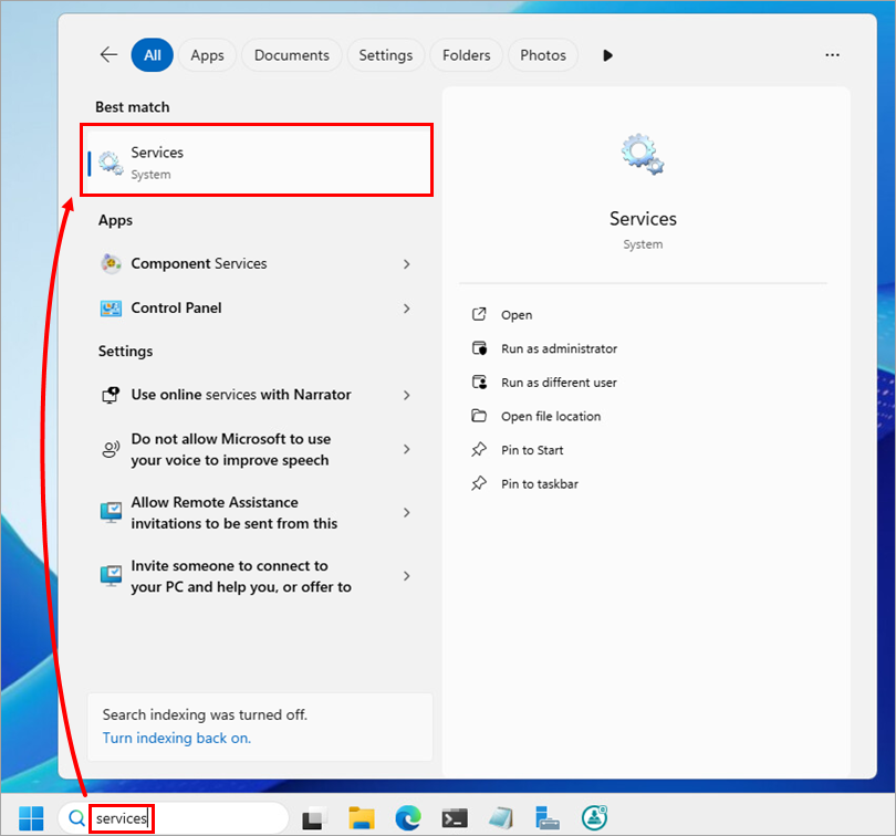 Run the Services application: in the search box on the taskbar, type services and click Services.