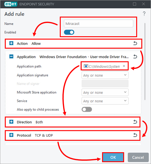 C:\Windows\System32\WUDFHost.exe. - In the Direction section, select Both.