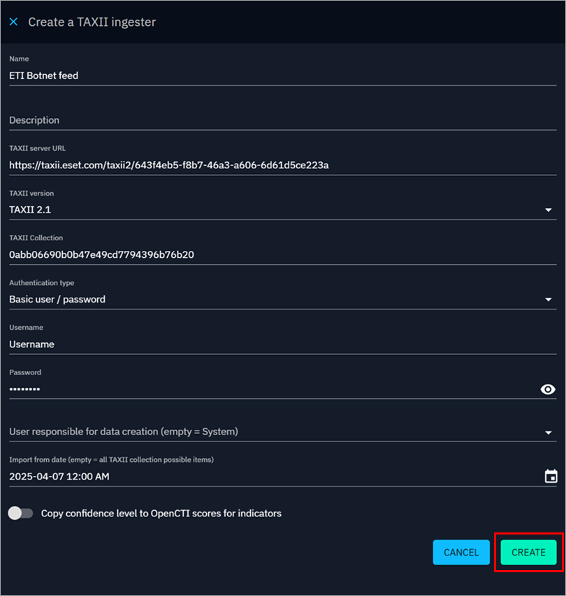 - You need to utilize the OpenCTI TAXII2 ingester to ingest the ESET Threat Intelligence feed data