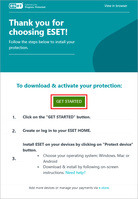Open the email you received from ESET Global eStore, read the instructions below the GET STARTED button and click GET STARTED. You will be redirected to ESET HOME web portal.