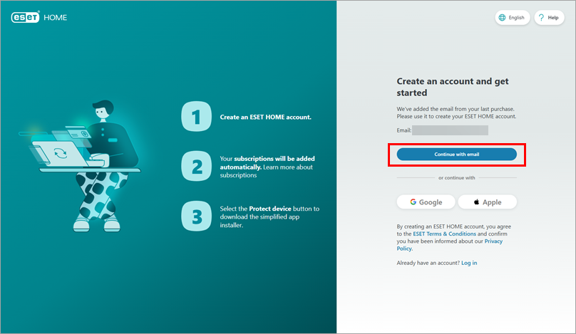 On the ESET HOME web portal, click Continue with email. Alternatively, use a Google account or Apple ID to create your ESET HOME account.