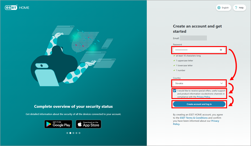 Type the password that you want to use with your ESET HOME account and select your country. If you want to receive special offers, useful support, and product information, select the check box above the Create account and log in button. When all set, click Create account and log in.