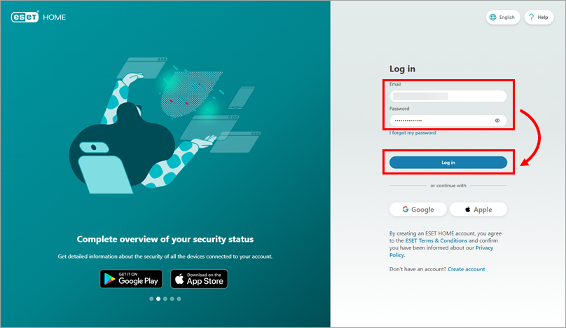 On the ESET HOME web portal, type your email address and password and click Log in. Alternatively, use a Google account or Apple ID to log in to your ESET HOME account.