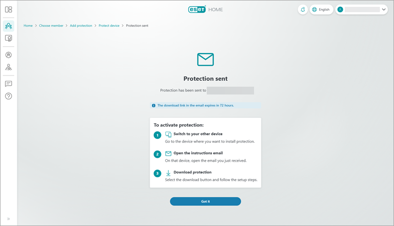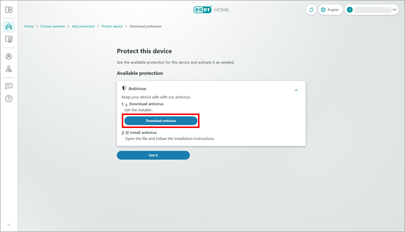 If additional protection is needed after the onboarding, you can download and install ESET home or small office product for another member or device.
