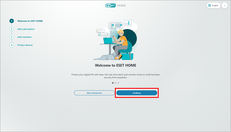 If you have not used the link in the subscription email or you have just created a new ESET HOME account, you will see the Welcome to ESET HOME screen. To work through the introduction, click Continue until you reach the Add subscription section. Alternatively, click Skip introduction.