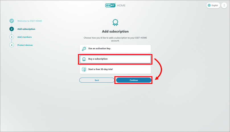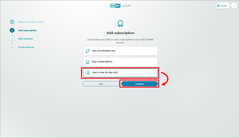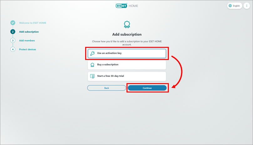 In the Add subscription section, choose how you want to add a subscription to your ESET HOME account. You can either use an activation key to add your purchased subscription, purchase a subscription, or start a free trial.