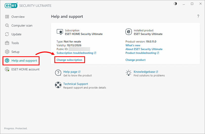 Click Help and support → Change subscription.