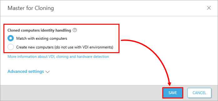 Choose how the identity of the selected computer's clones should be handled: select an option and click Save. Optionally, define the Advanced settings.