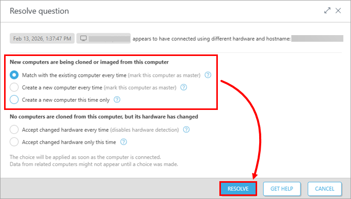 To avoid receiving a question every time a computer is cloned, you can define the clone identity-handling behavior for a computer through the Master for Cloning setting. When a computer is marked as a master, the server automatically applies the selected identity‑handling rule to all future clones generated from that computer.
