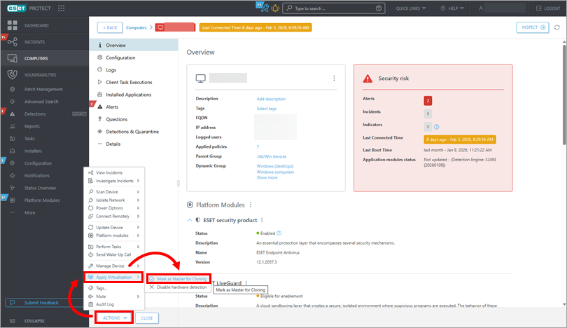 After you clone and power on a computer in your virtualization management platform, by default, you must resolve a cloning question to determine how the clone's identity should be handled in ESET PROTECT or ESET PROTECT On-Prem. For more information, see Resolving cloning questions (ESET PROTECT) or Resolving cloning questions (ESET PROTECT On-Prem).
