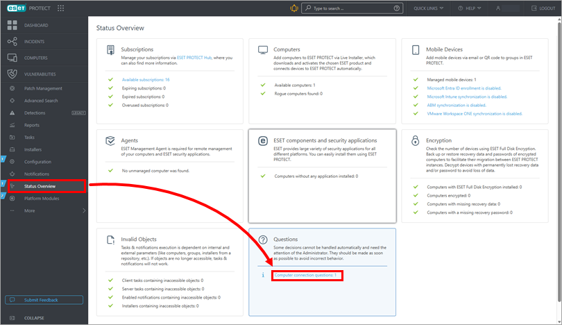 Click Status Overview and click Computer connection questions under Questions.