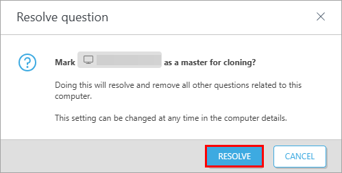 If you selected an option including the Master for Cloning setting, read the information in the related dialog box and click Resolve.